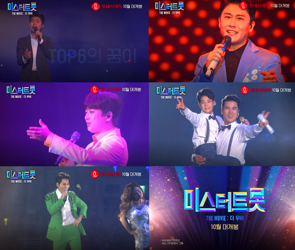 이외에도 ‘미스터트롯: 더 무비’에는 TOP6의 다채로운 모습이 담겼으며 라이브 포스터가 예고하는 완벽한 무대들은 물론, 서로에 대한 마음을 털어놓은 진솔한 인터뷰, 함께 떠난 1박 2일 MT에서 벌어진 다양한 에피소드들이 10월 극장가를 수놓을 예정입니다.