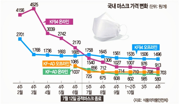 마스크 가격 변화를 살펴보면 이렇다. ‘마스크 대란’이 한창이던 2~3월에는 온라인 평균 판매가격이 개당 4000원대였다. 당시에는 공적 마스크를 안정적으로 공급하기 위해 민간에 풀리는 물량이 적었고, 비쌀지라도 잦은 품절로 ‘없어서 못 사는’ 형국이었다.