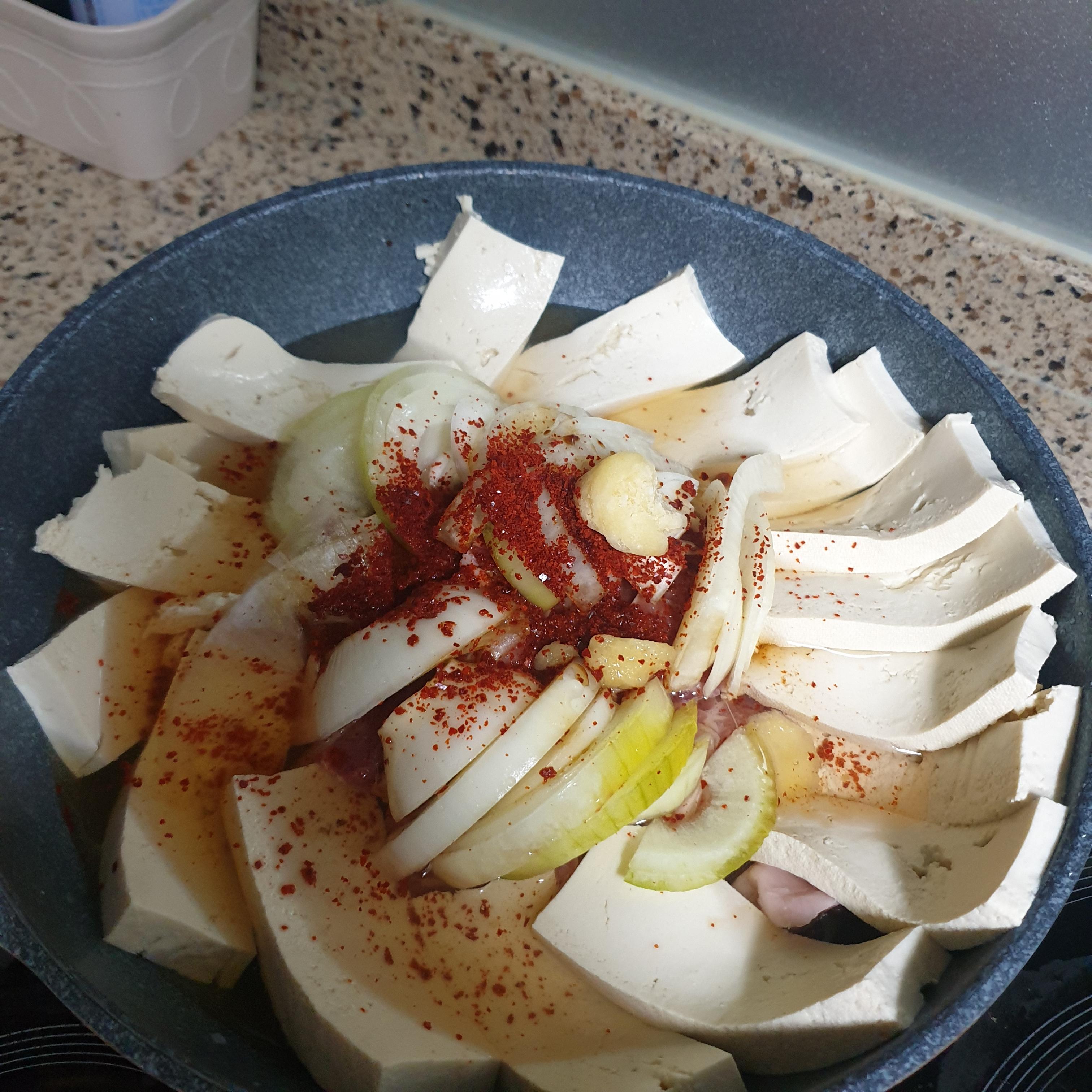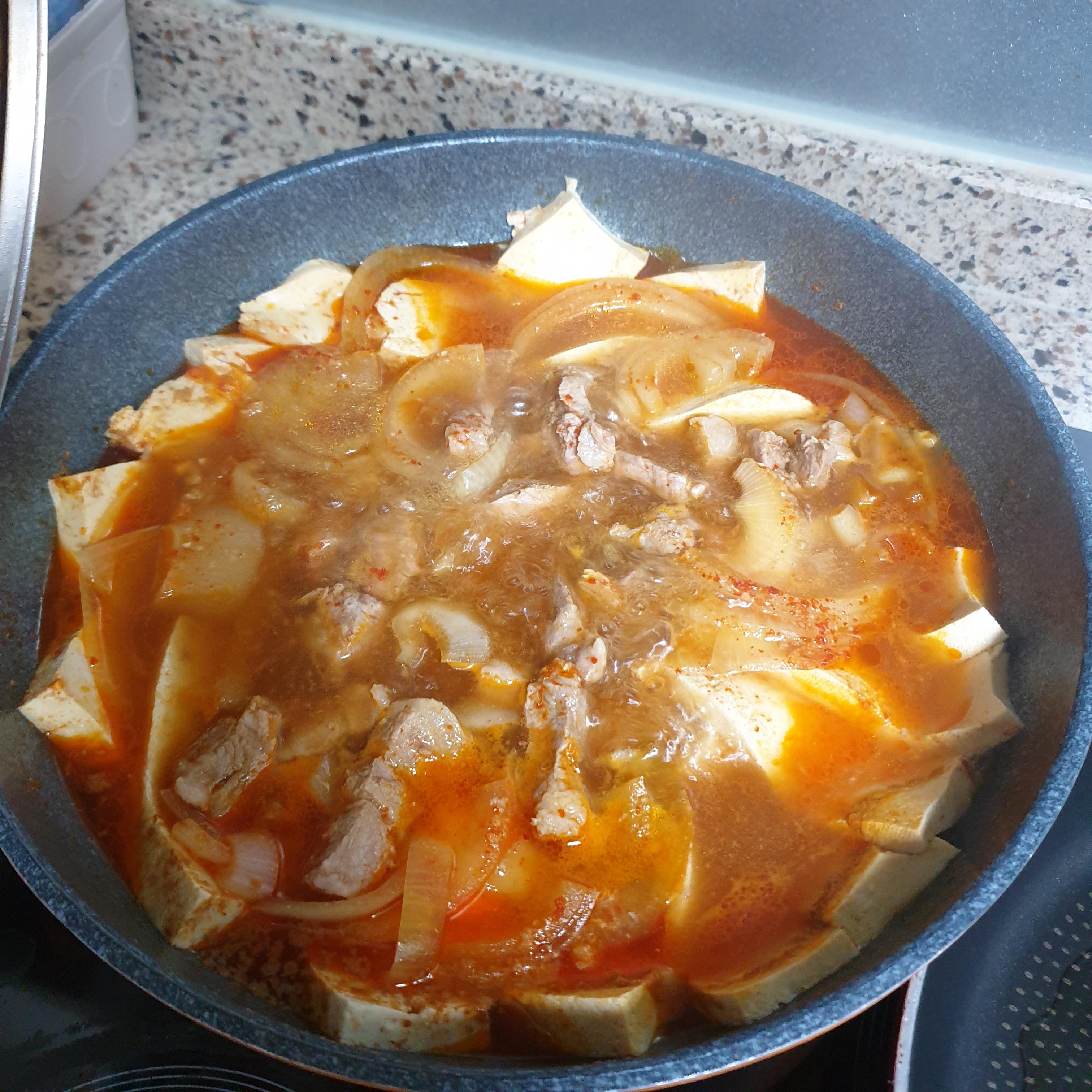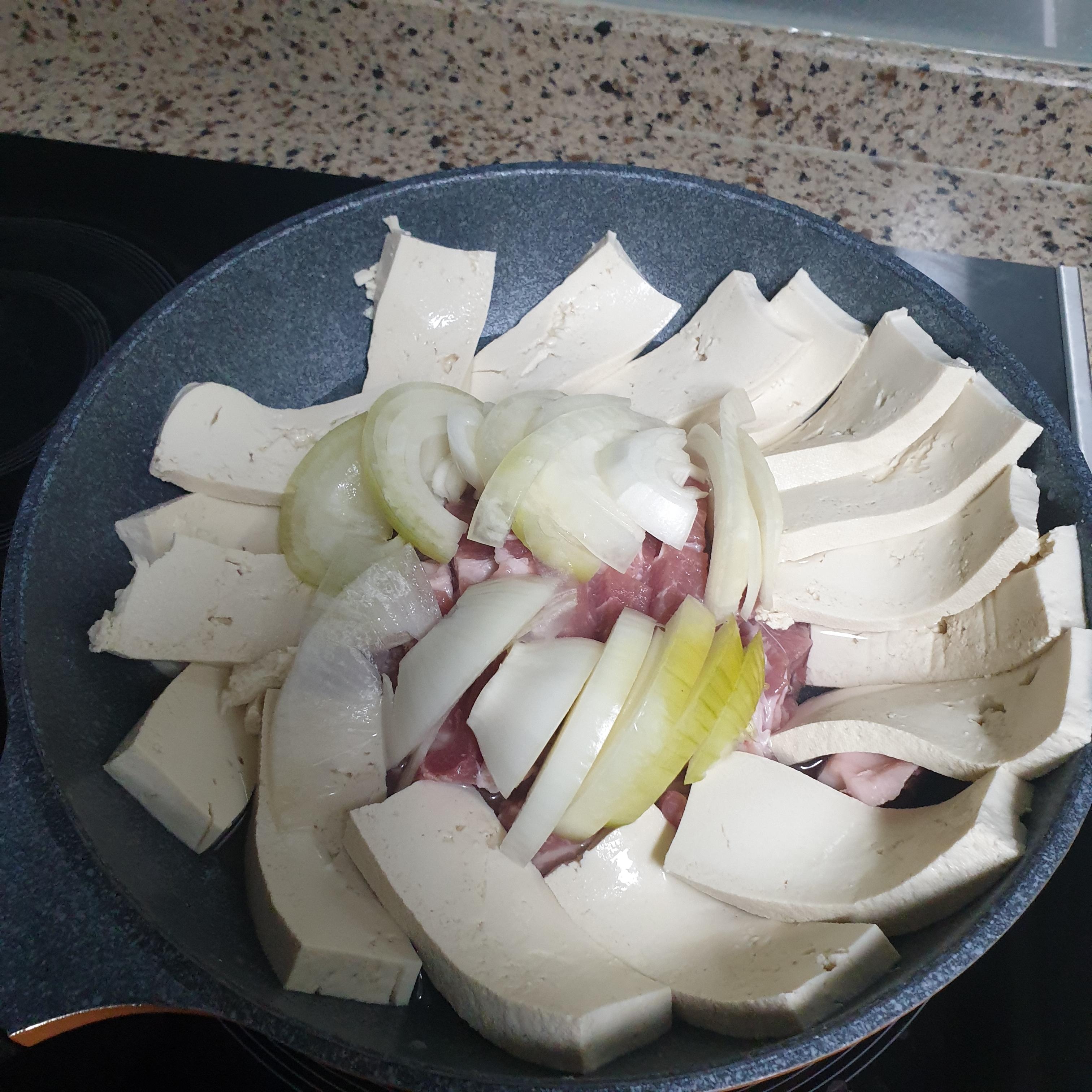 두부, 돼지고기(목살), 양파를 준비하여 같이 넣습니다.