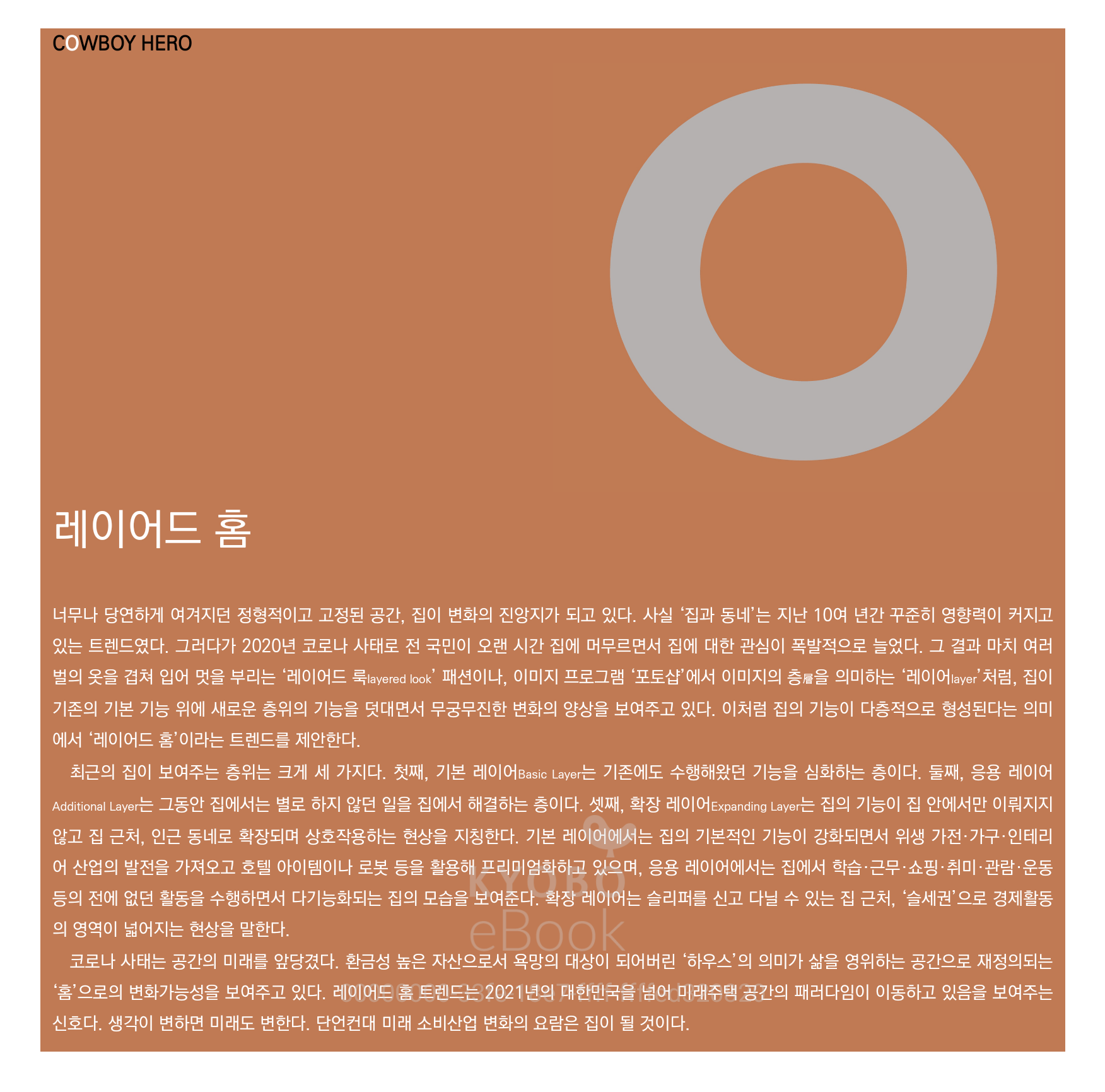 너무나 당연하게 여겨지던 정형적이고 고정된 공간, 집이 변화의 진앙지가 되고 있다. 사실 집과 동네'는 지난 10여 년간 꾸준히 영향력이 커지고있는 트렌드였다. 그러다가 2020년 코로나 사태로 전 국민이 오랜 시간 집에 머무르면서 집에 대한 관심이 폭발적으로 늘었다. 그 결과 마치 여러벌의 옷을 겹쳐 입어 멋을 부리는 '레이어드 룩layered look' 패션이나, 이미지 프로그램 포토샵에서 이미지의 층層을 의미하는 '레이어layer' 처럼, 집이기존의 기본 기능 위에 새로운 층위의 기능을 덧대면서 무궁무진한 변화의 양상을 보여주고 있다. 이처럼 집의 기능이 다층적으로 형성된다는 의미에서 '레이어드 홈'이라는 트렌드를 제안한다.