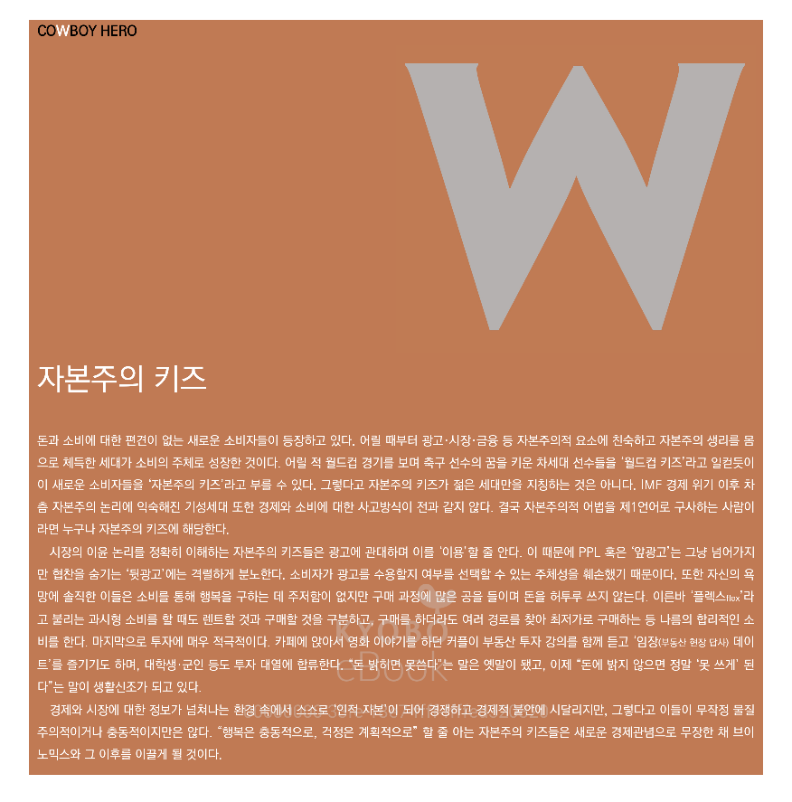 돈과 소비에 대한 편견이 없는 새로운 소비자들이 등장하고 있다. 어릴 때부터 광고 · 시장·금융 등 자본주의적 요소에 친숙하고 자본주의 생리를 몸으로 체득한 세대가 소비의 주체로 성장한 것이다. 어릴 적 월드컵 경기를 보며 축구 선수의 꿈을 키운 차세대 선수들을 '월드컵 키즈' 라고 일컫듯이 이 새로운 소비자들을 '자본주의 키즈'라고 부를 수 있다. 그렇다고 자본주의 키즈가 젊은 세대만을 지칭하는 것은 아니다. IMF 경제 위기 이후 차츰 자본주의 논리에 익숙해진 기성세대 또한 경제와 소비에 대한 사고방식이 전과 같지 않다. 결국 자본주의적 어법을 제1언어로 구사하는 사람이라면 누구나 자본주의 키즈에 해당한다.