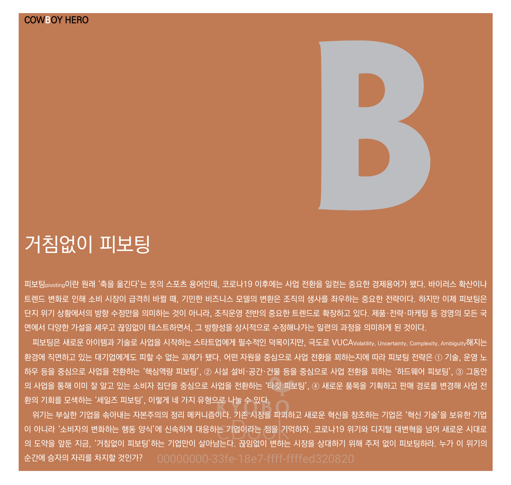 피보팅pivoting이란 원래 '축을 옮긴다'는 뜻의 스포츠 용어인데, 코로나19 이후에는 사업 전환을 일컫는 중요한 경제용어가 됐다. 바이러스 확산이나 트렌드 변화로 인해 소비 시장이 급격히 바뀔 때, 기민한 비즈니스 모델의 변환은 조직의 생사를 좌우하는 중요한 전략이다. 하지만 이제 피보팅은 단지 위기 상황에서의 방향 수정만을 의미하는 것이 아니라, 조직운영 전반의 중요한 트렌드로 확장하고 있다. 제품 · 전략 · 마케팅 등 경영의 모든 국면에서 다양한 가설을 세우고 끊임없이 테스트하면서, 그 방향성을 상시적으로 수정해나가는 일련의 과정을 의미하게 된 것이다.