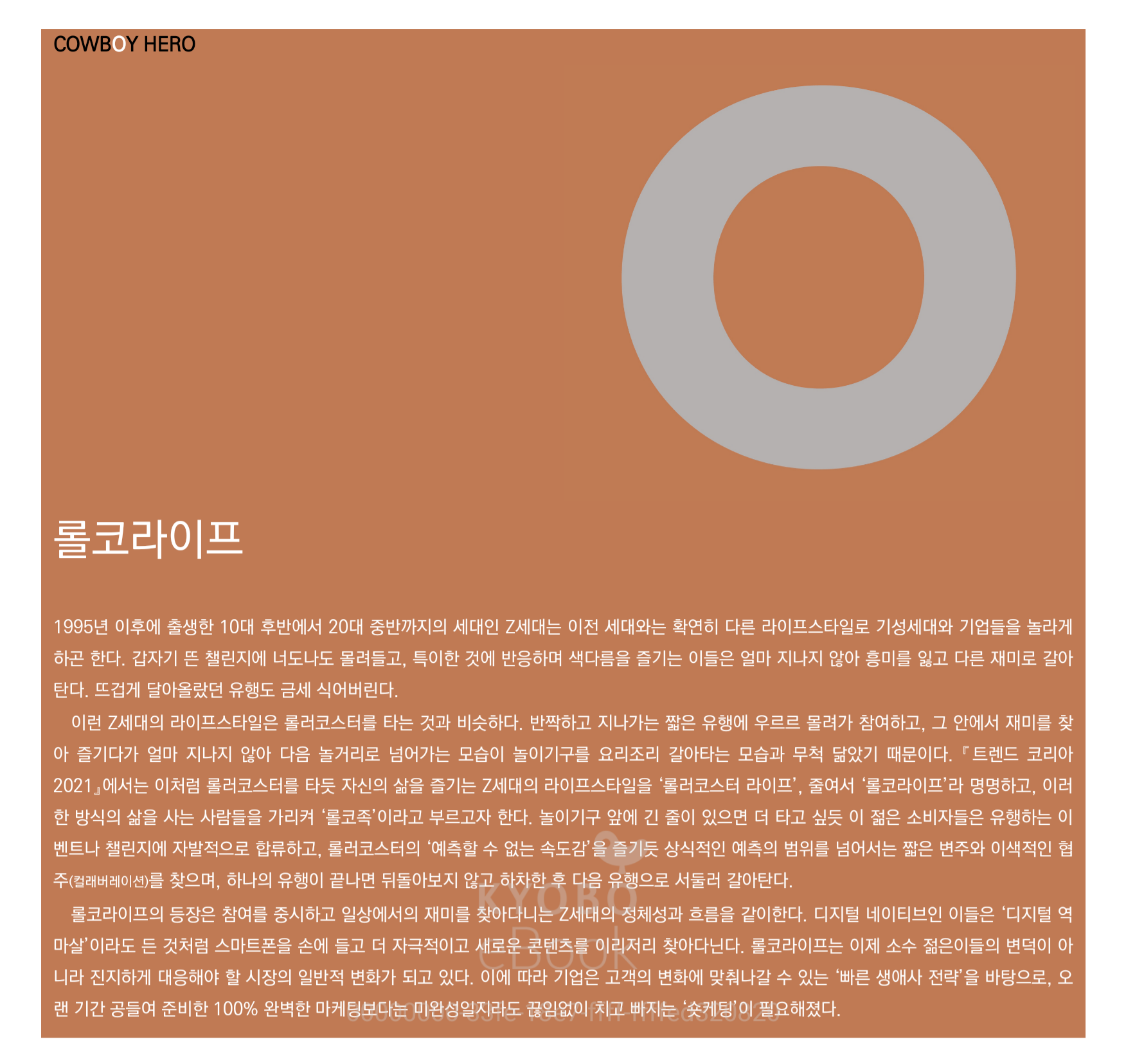 「트렌드 코리아 2021」에서는 이처럼 롤러코스터를 타듯 자신의 삶을 즐기는 Z세대의 라이프스타일을 '롤러코스터 라이프', 줄여서 '롤코라이프'라 명명하고, 이러한 방식의 삶을 사는 사람들을 가리켜 '롤코족'이라고 부르고자 한다.