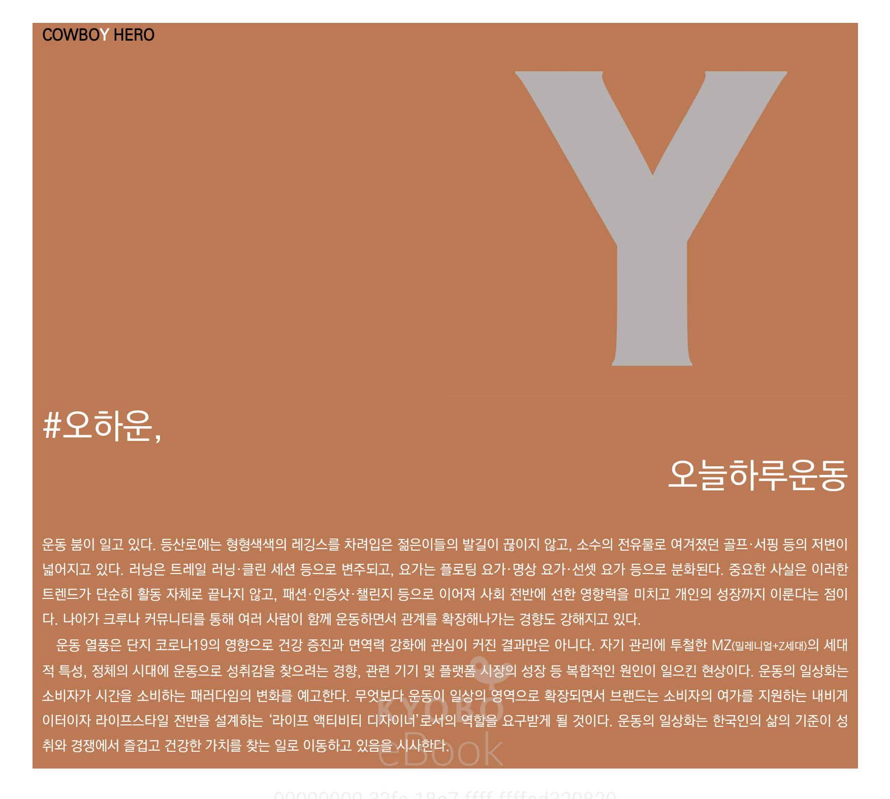운동 붐이 일고 있다. 등산로에는 형형색색의 레깅스를 차려입은 젊은이들의 발길이 끊이지 않고, 소수의 전유물로 여겨졌던 골프 · 서핑 등의 저변이 넓어지고 있다. 러닝은 트레일 러닝 · 클린 세션 등으로 변주되고, 요가는 플로팅 요가·명상 요가 · 선셋 요가 등으로 분화된다. 중요한 사실은 이러한 트렌드가 단순히 활동 자체로 끝나지 않고, 패션 - 인증샷·챌린지 등으로 이어져 사회 전반에 선한 영향력을 미치고 개인의 성장까지 이룬다는 점이다. 나아가 크루나 커뮤니티를 통해 여러 사람이 함께 운동하면서 관계를 확장해나가는 경향도 강해지고 있다.