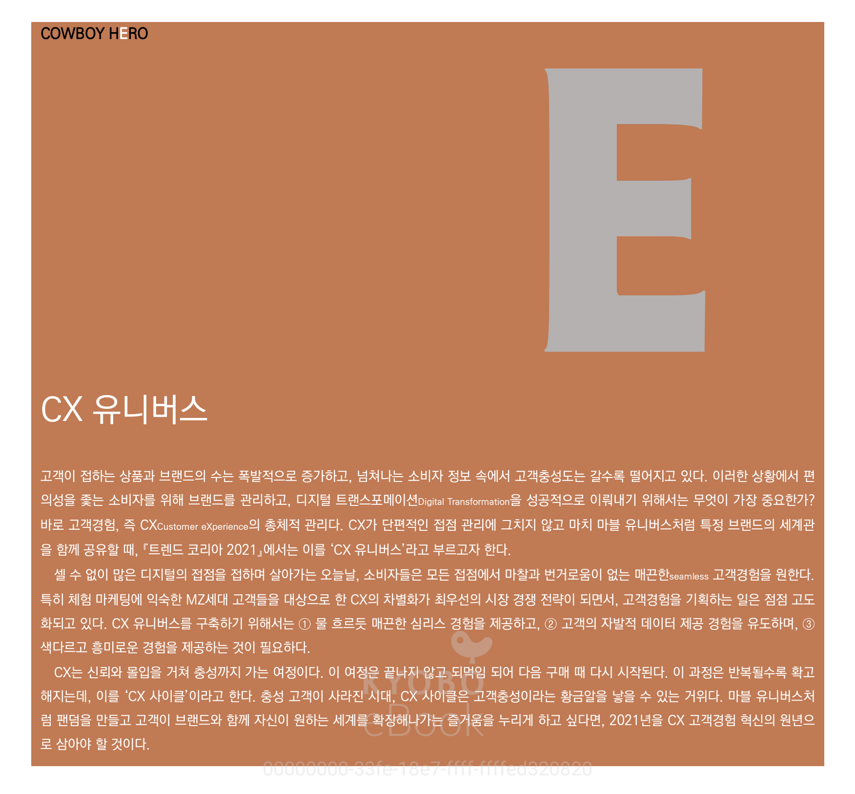 고객이 접하는 상품과 브랜드의 수는 폭발적으로 증가하고, 넘쳐나는 소비자 정보 속에서 고객충성도는 갈수록 떨어지고 있다. 이러한 상황에서 편의성을 좇는 소비자를 위해 브랜드를 관리하고, 디지털 트랜스포메이션 Digital Transformation을 성공적으로 이뤄내기 위해서는 무엇이 가장 중요한가? 바로 고객경험, 즉 CXcustomer eXperience의 총체적 관리다. CX가 단편적인 접점 관리에 그치지 않고 마치 마블 유니버스처럼 특정 브랜드의 세계관을 함께 공유할 때, 『트렌드 코리아 2021』에서는 이를 'CX 유니버스'라고 부르고자 한다.