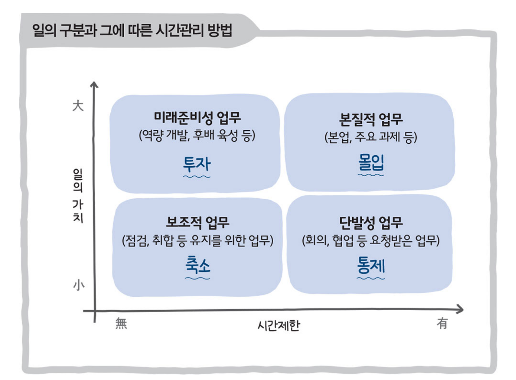 '미래준비성 업무는 당장 성과가 눈에 띄게 나타나는 업무는 아니더라도 개인과 조직의 미래를 위해 현재 꼭 수행해야 하는 장기적 과업을 가리킨다. 예를 들어, 개인의 역량을 개발하는 일이나 조직의 미래를 책임질 후배를 육성하는 일 등이 여기 해당한다. 즉, 미래에 본질적 업무를 더욱 잘 수행하기 위한 밑거름이 되는 일을 말한다. 이러한 미래준비성 업무는 장기 성과에 큰 영향을 미치기 때문에 일의 가치가 높다고 볼 수 있지만, 언제까지 꼭 수행해야 한다는 시간제한은 없다. 그러나 역설적이게도 시간의 압박이 없기 때문에 그 중요성에도 불구하고 간과하거나 놓치기 쉬운 일이기도 하다.