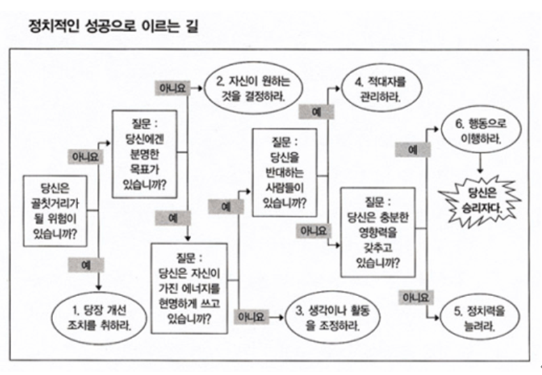 아래의 표는 현재 처한 정치적 상황을 평가하는 데 있어 고려해야 할 몇 가지 기본적인 질문들을 요약한 것이다. 당신의 대답이 즉각적인 문제를 나타내는 경우, 화살표를 따라가면 그 문제를 해결할 수 있는 일반적인 전략을 알려줄 것이다. 반대로 문제가 없는 경우엔, 다음 질문으로 넘어가면 되고 계속 길을 따라가다 보면 정치적인 승자의 위치까지 도달할 것이다.
