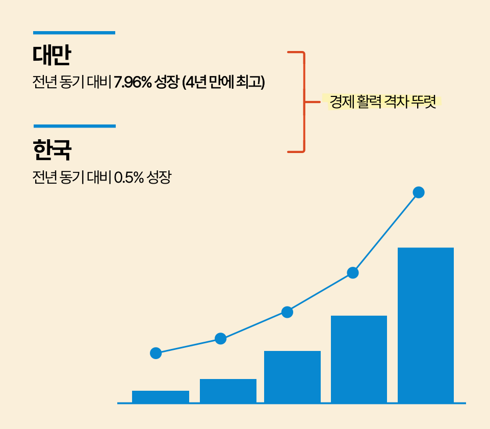 - 2025년 2분기 경제성장률에서 **대만은 7.96%**를 기록한 반면, **한국은 0.5~0.6%**로 매우 저조합니다. 이로 인해 양국의 경제 활력 격차가 확연히 드러난다고 설명합니다2.